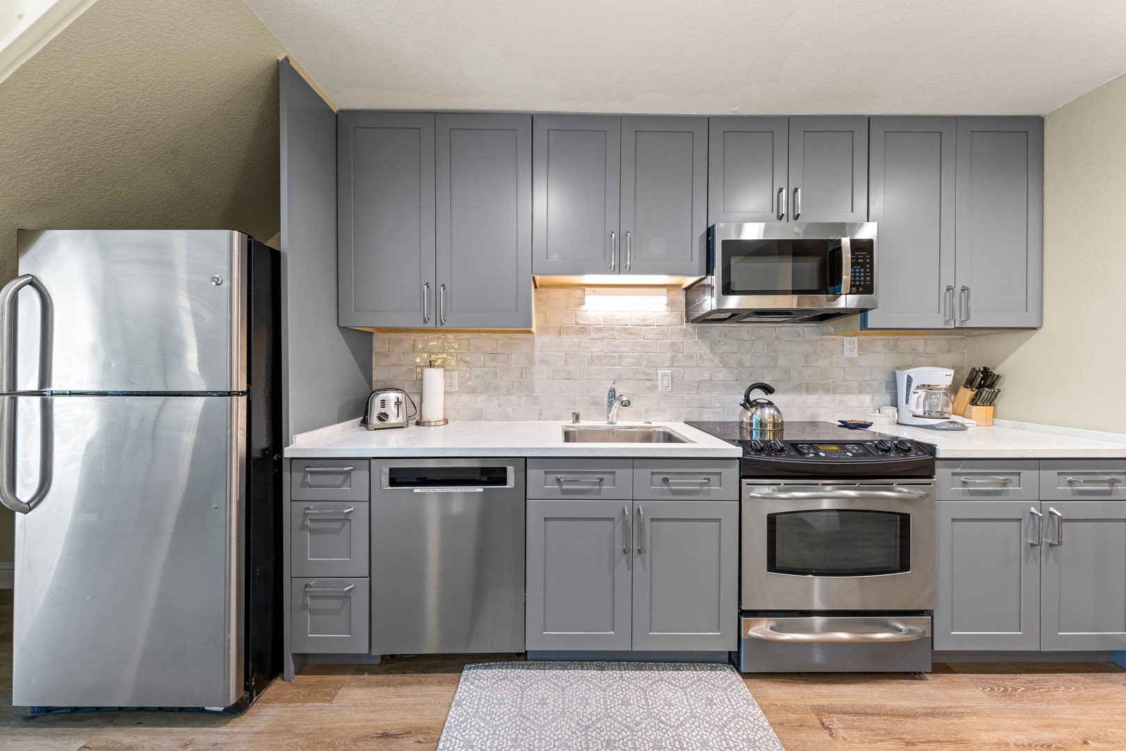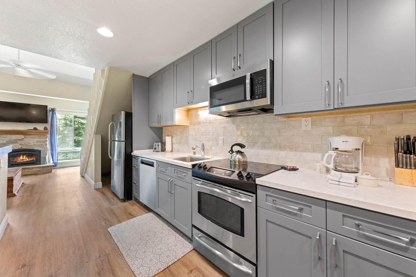 • The updated kitchen includes utensils, a full refrigerator, microwave, dishwasher, coffee maker, stove top, and oven.
