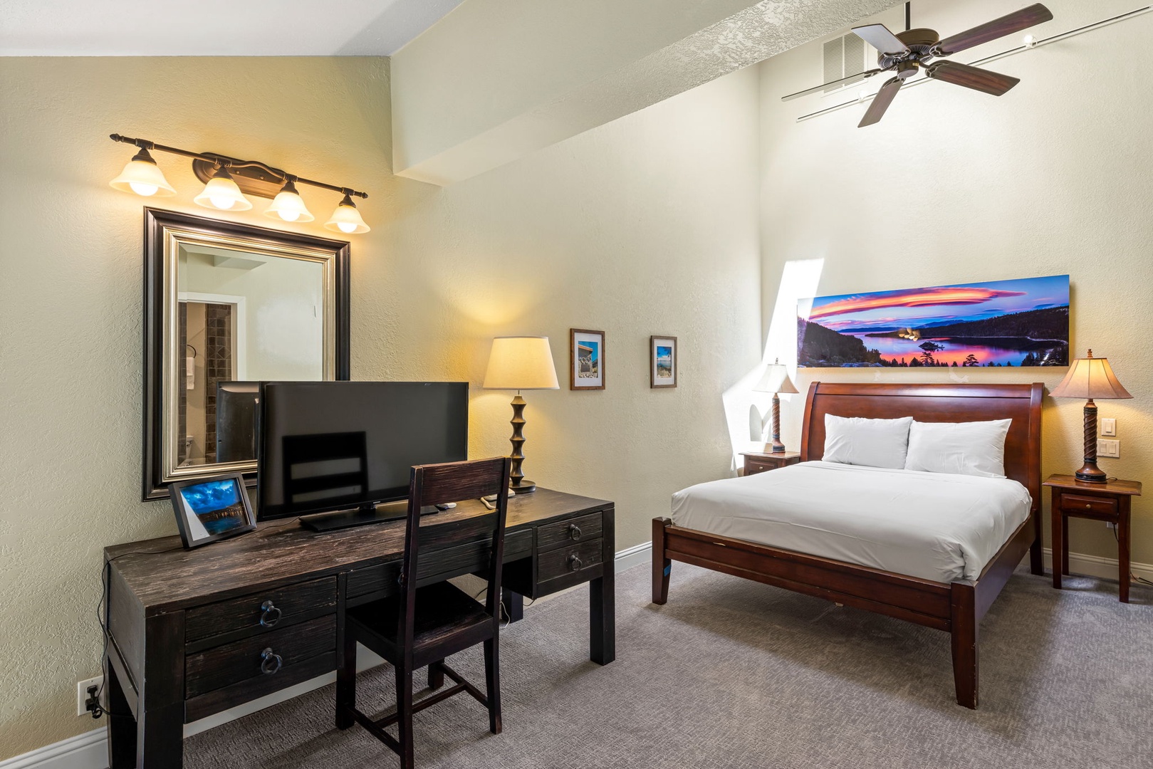 • Upstairs provides a queen bed, desk, television, and bathroom.