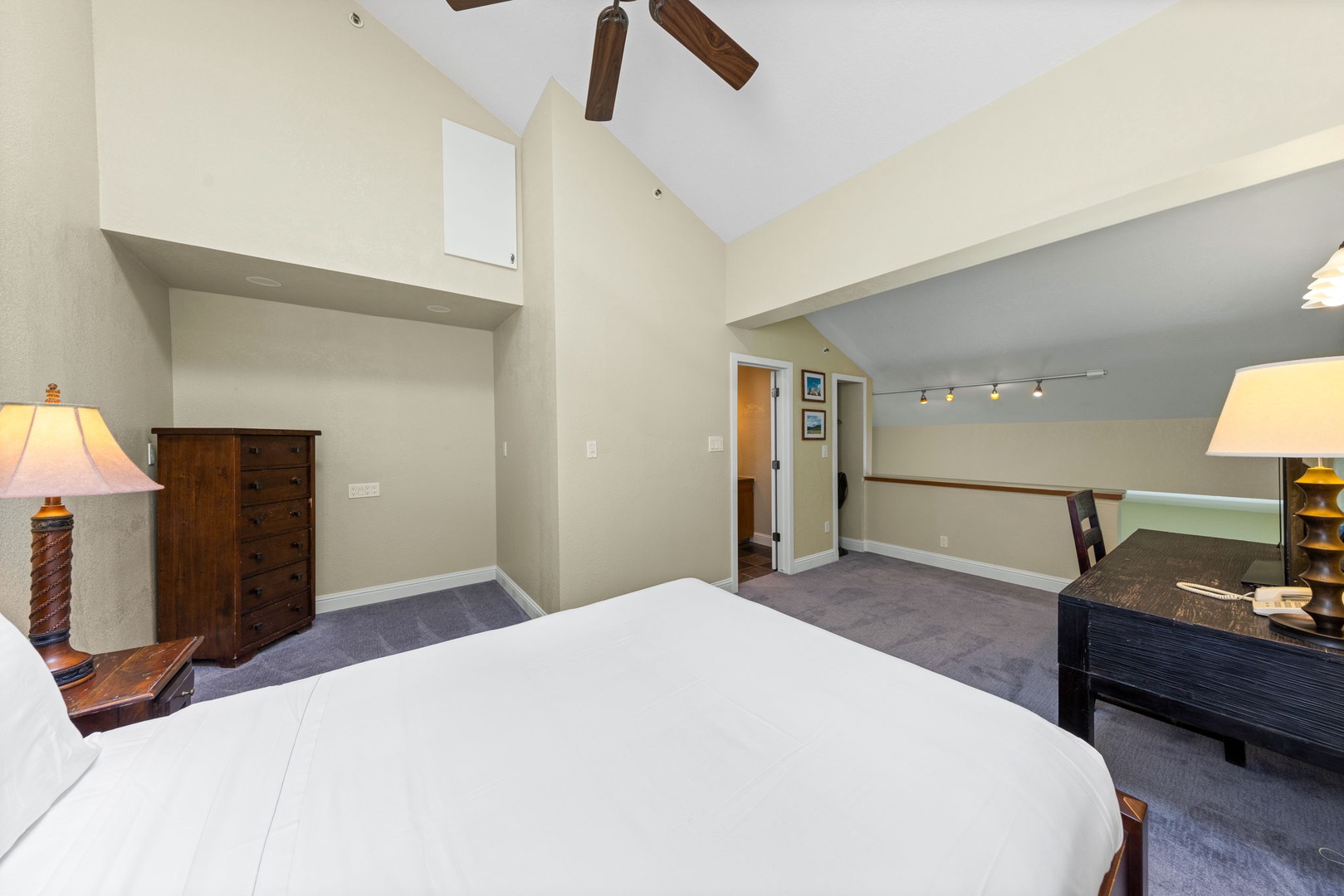 Upstairs is the loft great escape zone. The bed zone has a queen bed, a tall dresser and TV. It also has a curtain that closes it off for privacy. There is a desk if needed and a bathroom with beautiful tile upgrades.