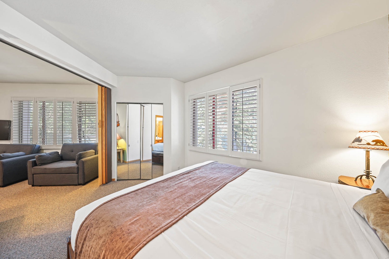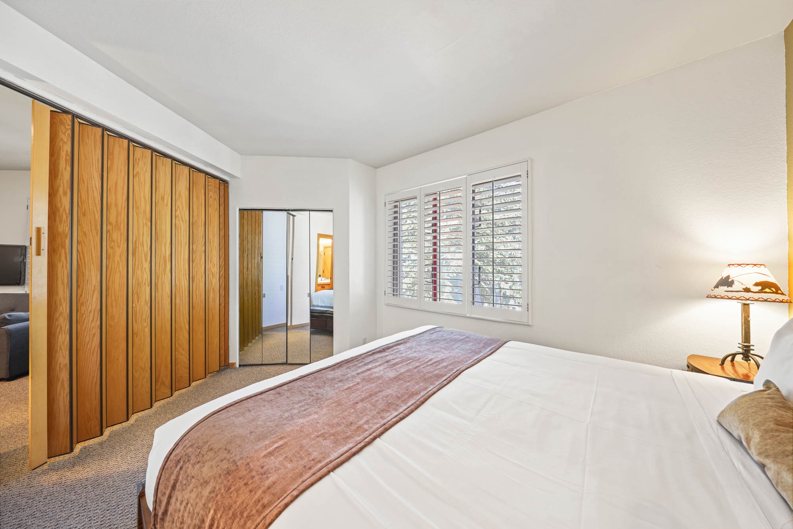 • The bedroom has a king bed and a sliding door for privacy.